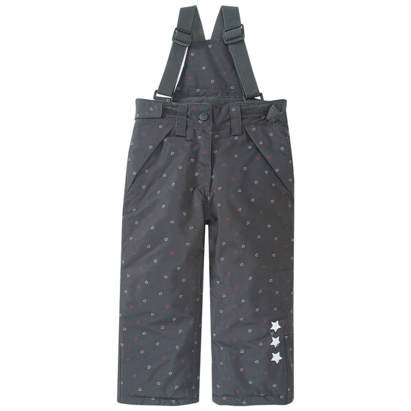 Ein Herz für Schnee! Dunkelgraue Schneehose mit kleinen bunten Herzen allover. Elastische, verstellbare Hosenträger, die vorne mittels Klett geöffnet werden können. Elastischer Bund mit Druckknopf, verdecktem Reißverschluss, fünf Gürtelschlaufen und Klettverschluss zur Weitenregulierung. Seitlich zwei praktische Eingrifftaschen. An den Hosenbeinen mit Klettverschluss und integriertem Schneefang mit rutschhemmender Gummierung. Warm und weich wattiert. Wasserdichte Nähte und diverse reflektierende Elemente. Atmungsaktiv, wind- und wasserabweisend. Der Global Recycling Standard (GRS) hilft uns, den Recyclinganteil unserer Produkte zu überprüfen. Darüber hinaus wird kontrolliert, ob die durch den Standard festgeschriebenen sozialen, ökologischen und chemischen Vorschriften in der Produktion erfüllt werden.
