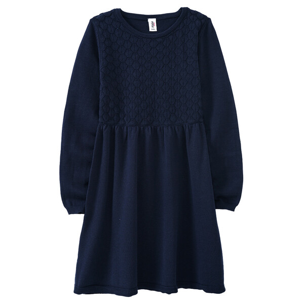 Schick in Strick! Dunkelblaues Kleid aus glattem Feinstrick mit strukturiertem Muster vorne auf dem Oberteil. Mit Rundhalsausschnitt und gerippten Bündchen an den Abschlüssen. In der Taille angesetzter Rockteil mit leichter Raffung.