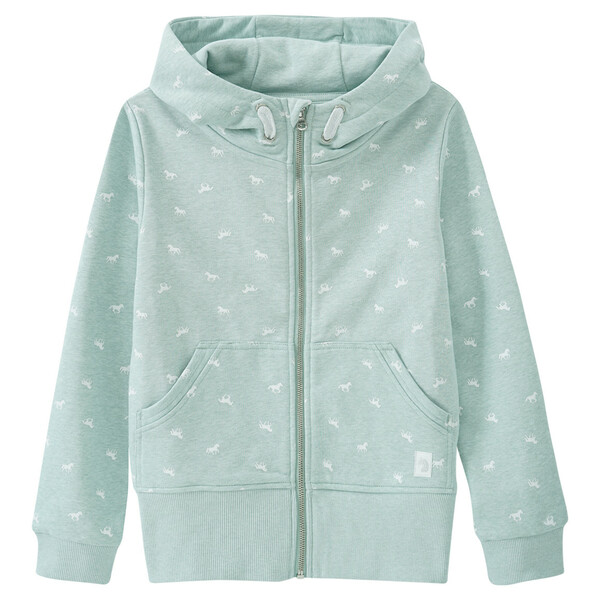 So viele Pferde! Sweatjacke in Hellgrün mit kleinen Pferden in Weiß allover bedruckt. Hoch abschließende Kapuze, doppellagig und mit imitiertem Tunnelzug gearbeitet. Kinnschutz am durchgehenden Reißverschluss und geteilte Kängurutasche. Formstabile Rippenbündchen an den Armausschnitten und am Saum. Innen kuschelig weich. Cotton made in Africa setzt sich für einen ökonomisch, sozial und ökologisch nachhaltigeren Baumwollanbau in Subsahara-Afrika ein und trägt damit zu einer Verbesserung der Lebensbedingungen kleinbäuerlicher Familien bei.