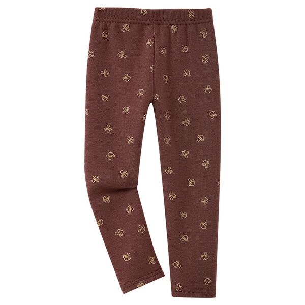 Lasst uns Pilze sammeln! Gefütterte Thermo-Leggings in Dunkelbraun mit Allover-Pilz-Print. Elastischer Bund für einen bequemen Sitz. Innen mit kuscheligem Plüschfutter in Schwarz. Figurnah geschnitten.