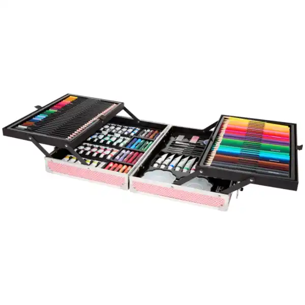 - Enthält Ölpastellkreiden, Bunt- und Aquarellstifte, Acryl- und Aquarellfarben, Pinsel, Paletten, Radiergummis und einen Anspitzer
