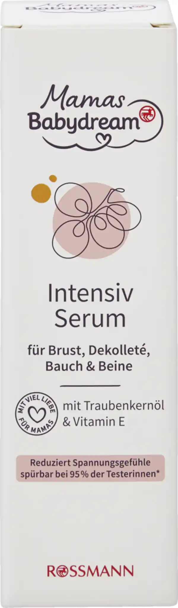 Unser Mamas Babydream Intensiv Serum wurde optimal auf die Haut in der Schwangerschaft abgestimmt. Die schützende Intensivpflege kann der Haut spürbar mehr Elastizität verleihen und kann bei regelmäßiger Anwendung die Bildung von Schwangerschaftsstreifen minimieren. Spannungsgefühle werden ab der ersten Anwendung gemindert - für ein maximales Wohlbefinden ohne trockenheitsbedingte Spannungsgefühle.Die Rezeptur mit:-Traubenkernöl macht die Haut spürbar geschmeidig-Vitamin E pflegt beanspruchte Haut intensivOHNE FarbstoffeOHNE Mineral-, Paraffin- & SilikonöleHautverträglichkeit dermatologisch bestätigtBestätigte Wirksamkeit: -Reduziert Spannungsgefühle spürbar bei 95% der Testerinnen*-Die Haut fühlt sich bei 100% der Testerinnen* nach der Anwendung samtweich und geschmeidig an-Das Spezial Konzentrat lässt sich bei 100% der Testerinnen* gut auf der Haut verteilen*Anwendungstest mit 20 Testerinnen subjektive Bewertung nach 7 Tagen