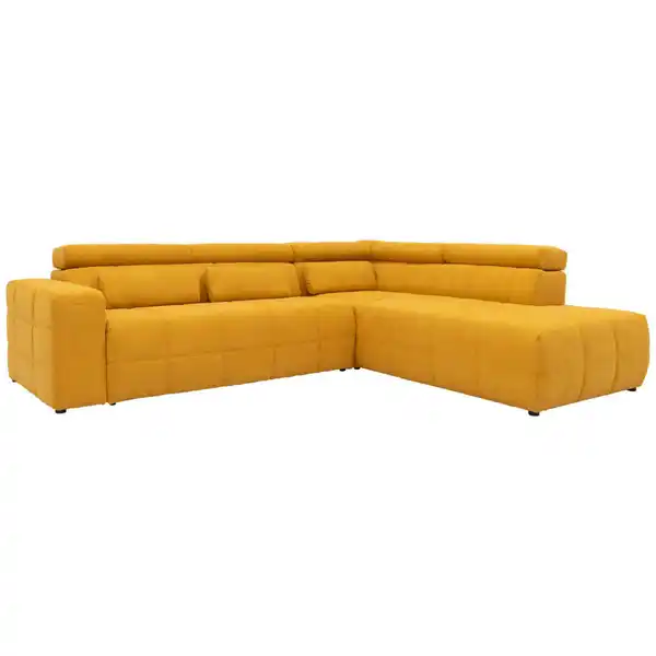 Dieses Mid.you Ecksofa in Orange lädt Sie als Mittelpunkt des Wohnzimmers zum Relaxen ein. Wichtige Details im Überblick: L-Form: ca. 275 x 228 cm (Schenkelmaße) Draufsicht davorstehend: Ottomane rechts – auch seitenverkehrt erhältlich Höhe: ca. 80 cm Anzahl der Sitzplätze: ca. 3 Sitzfläche: ca. 211 x 62 cm (B x T), Sitzhöhe: ca. 42 cm maximale Belastbarkeit: ca. 300 kg maximale Belastbarkeit pro Sitz: ca. 100 kg Armlehnen: ca. 25 x 58 cm (B x H) Fußhöhe: ca. 2,5 cm Offensichtlicher Wohlfühlfaktor Der Bezug aus Mischgewebe (ca. 92 % Polyester & 8 % Nylon) mit Mikrofaser-Oberfläche überzeugt mit resistenten Vorzügen und seiner weichen Haptik ebenso wie mit einer nur geringen Pillingbildung und einer guten Abriebfestigkeit. Eine bequeme Schaumstoff-Polsterung mit Wellenunterfederung, die zu tiefem Einsinken entgegenwirkt, unterstützt den Körper und ruft Komfort hervor. Luftdurchlässig, belastbar und formstabil verhält sich der wärmeisolierende Polyetherschaumkern. Trotz dessen hoher Punktelastizität dürfen Sie sich über ein eher legeres Sitzgefühl freuen. Die Krönung der Ausstattung bildet eine manuelle Kopfteilverstellung für wohlige Regenerationsbedingungen. Sehenswerter Hingucker Die prägnante Farbgebung in Orange passt mit dem immer passenden Uni-Dessin in unterschiedlichste Einrichtungsstile. Runde Füße in Schwarz vervollständigen stilgerecht das Design. Im Lieferumfang enthalten: Kopfteilverstellung (manuell) Verwöhnen Sie sich selbst mit diesem orangen Ecksofa mit Mikrofaser-Bezug! Preis versteht sich ohne abgebildete Dekoration. Informationen zu separat bestellbarem Equipment ode