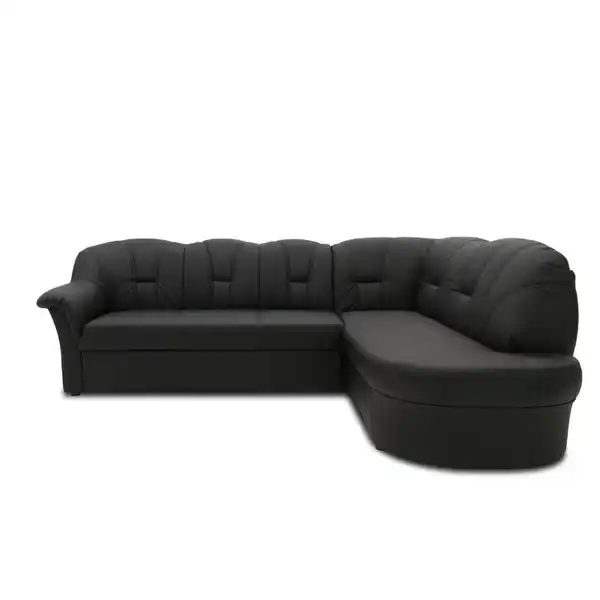 Dieses Mid.you Ecksofa in Schwarz rückt auf beeindruckende Art Gemütlichkeit in den Fokus. Wichtige Details im Überblick: L-Form: ca. 243 x 180 cm (Schenkelmaße) Höhe: ca. 84 cm Anzahl der Sitzplätze: ca. 4 Sitzfläche: ca. 151 x 50 cm (B x T), Sitzhöhe: ca. 40 cm maximale Belastbarkeit: ca. 400 kg maximale Belastbarkeit pro Sitz: ca. 100 kg Liegefläche der Bettfunktion: ca. 112 x 185 cm (B x L), Liegehöhe: ca. 40 cm Armlehnen: ca. 24 x 57 cm (B x H) Fußhöhe: ca. 2,5 cm Erlebbare Gemütlichkeit Der Bezug, gefertigt aus Synthetikfaser (ca. 100 % Polyurethan (Pu)) mit Lederlook-Oberfläche, ist widerstandsfähig und sieht attraktiv aus. Eine angenehme Schaumstoff-Polsterung mit Wellenunterfederung, die zu tiefes Einsinken verhindert, unterstützt den Körper und fördert den Komfort. Der kleinporige Polyurethanschaumkern behält nicht nur seine Form, er verhält sich auch sehr punktelastisch, was für ein überaus bequemes Sitzgefühl sorgt. Da er zudem wärmeisolierend, luftdynamisch und hygienisch ist, werden vor allem die Herzen von Allergikern höherschlagen. Mit der integrierten Schlaffunktion kommt das Sofa bei Bedarf als einladendes Gästebett zum Einsatz. Makelloses Design Das Polstermöbel betont mit seiner eleganten Farbgebung in Schwarz sowie dem unaufgeregten Uni-Dessin ein geschmackvolles Ambiente. Füße in Schwarz vervollständigen stilgerecht das Design. Im Lieferumfang enthalten: Schlaffunktion: Schlafen auf Sitzhöhe Mit diesem schwarzen Ecksofa mit Lederlook-Bezug landen Sie auf jeden Fall einen Volltreffer in Sachen Heimeligkeit! Preis versteht sich ohne abgebildete Dekoration.