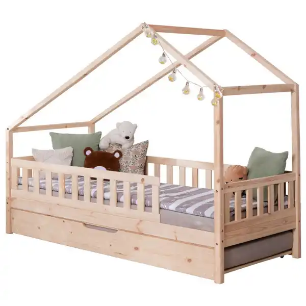 Mid.you Hausbett, Natur, Textil, Birke,Kiefer, Schichtholz,massiv, H2, Höhe ca. 16 cm, seitenverkehrt montierbar, 120x200 cm, transformierbar, nur für Rollroste geeignet, bodentiefer Einstieg, Kind