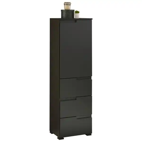 Zusammen mit weiteren Elementen aus derselben Serie gestaltet dieser Mid.you Midischrank fürs Bad in mattem Schwarz einen zeitgemäßen Spa-Bereich, der stylishe Ästhetik verkörpert. Das puristische Design setzt auf absolute Formenklarheit, wobei die Grifffräsungen das Erscheinungsbild stilgerecht abrunden. Beim Einsortieren Ihrer Badutensilien bleiben Sie flexibel, da ein höhenverstellbarer Einlegeboden eine variable Aufteilung des Stauraums hinter der nach rechts öffnenden Drehtür erlaubt. So können Sie die Höhe der Depots individuell anpassen. Zahlreiche Kleinigkeiten kommen ordentlich in den 3 Schubladen unter, die Platz für allerlei Accessoires bieten. Hier präsentiert sich Funktionalität in einem dauerhaft angesagten Look. Denn so ein ca. 40 cm breiter Midischrank fürs Bad in Schwarz bleibt immer up to date!