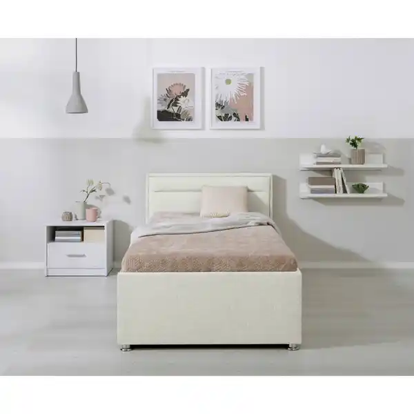Dieses Mid.you Polsterbett (Liegefläche: ca. 90 x 200 cm) in Creme inklusive Bettkasten begeistert als Ruhepol für entspannte Nächte. Maße und mehr auf einen Blick Liegefläche: ca. 90 x 200 cm (B x L) Gesamtmaße: ca. 106 x 213 x 80 cm (B x L x H) Liegehöhe: ca. 48 cm Die Komforthöhe erleichtert das Aufstehen und Hinlegen. Matratzenkernhöhe: ca. 13 cm Matratzenhöhe: ca. 16 cm max. Belastbarkeit: ca. 120 kg Kopfteil: ca. 106 x 80 cm (B x H) Fußhöhe: ca. 3,5 cm Ein kompatibler Lattenrost aus Holz mit 24 Leisten in Duokappen zur ausgleichenden Federung wird direkt mitgeliefert. Die Matratze mit Synthetikfaser-Hülle sowie Bonellfederkern gleicht den Druck sanft und flächenelastisch aus, weil die formbeständigen Metallfedern über Spiralen miteinander verbunden wurden. Genießen Sie einen mittleren Härtegrad: angeraten für Personen bis ca. 80 kg. Besondere Komfortmerkmale der Matratze Wendematratze rollbar Eine individuelle Einrichtung wird von dem Bett, hergestellt aus Echtholz (Hartholz), Holzwerkstoff, pulverbeschichtetem Carbonstahl, Kunststoff und mit einem Mischgewebe-Bezug (ca. 88 % Polyester, 9 % Kunstseide & 3 % Nylon) versehen, durch sein freundliches Kolorit in Creme unterstrichen. Schon gewusst? Das langlebige Buchenholz ist schwer, hart, strapazierfähig und besonders stoßfest. Dabei verfügt das Textil-Material sowohl über eine gute Lichtechtheit und eine gute Abriebfestigkeit als auch über eine nur geringe Tendenz zur Pillingbildung, das heißt, es entstehen nur sehr wenige Knötchen (Pills) durch Reibung. Ob beim Frühstück im Bett oder beim entspannten Serienabend, das gepolsterte Kopfteil lädt zum Ankuscheln ein. Der Bettkasten ergän