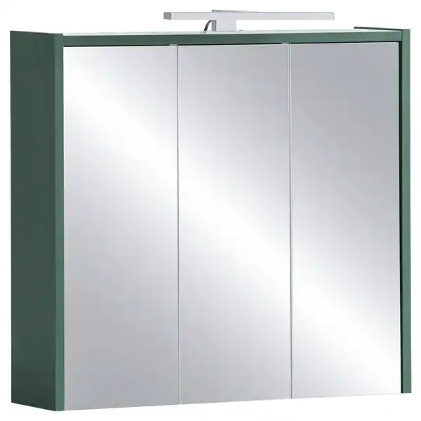 Zusammen mit weiteren Einrichtungselementen aus der Serie 'Lovis' gestaltet dieser ca. 65 x 62,7 x 16 cm (B x H x T) große Mid.you Spiegelschrank in Grün mit Beleuchtung einen Wohlfühlraum, in dem Sie sich gerne der Körperpflege widmen. Dabei präsentiert sich der Korpus in dunklem Waldgrün, während das Innere in Weiß gehalten ist - ein Look mit beruhigender Ausstrahlung. Was den Stauraum für Ihre Badezimmer-Utensilien betrifft, stehen Ihnen künftig hinter den 3 Spiegeltüren 9 Depots zur Verfügung. Deren Höhe lässt sich mithilfe der 6 verstellbaren Glasböden variabel festlegen. Ein Spiegelschrank in Grün mit LED-Beleuchtung, strapazierfähiger Melaminharzbeschichtung, Lichtschalter und integrierter Steckdose, der sich optisch wie funktional als Möbel nach Ihrem Geschmack zeigt!