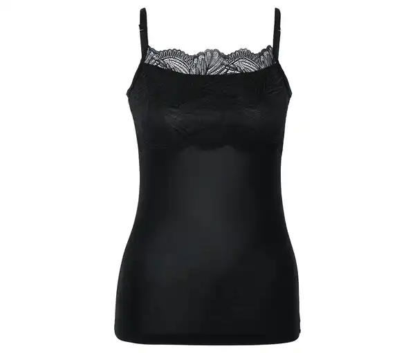 Modal-Hemdchen Farbe: Schwarz Material: 95% Modal, 5% Elasthan Spitze 83% Polyamid, 17% Elasthan Brustbereich mit zarter, weicher SpitzeAngenehm weiche Modal-Stretch-QualitätLängenverstellbare TrägerMit hochwertigem Markenelasthan für Langlebigkeit und hohe WaschbeständigkeitDieses Hemdchen beinhaltet Fasern aus nachhaltigem Holz.
