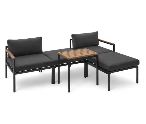 Modulares Garten-Lounge-Set, 5-teilig Farbe: Tischplatte Holzoptik Polsterbezüge anthrazit Gestell unter Sitzpolstern Holzoptik Füße schwarz Material: Gestell Aluminium, pulverbeschichtet Tischplatte Aluminium, Laserprint in Holzoptik Polsterbezug 100% Polypropylen Polsterfüllung 100% Polyurethan Bodenschoner 100% Polypropylen Maße: B x H x T insgesamt ca. 182 x 77 x 138 cm B x H x T einzelner Sessel ca. 68 x 77 x 64 cm B x H x T einzelnes Fußteil ca. 68 x 42 x 68 cm Sitzhöhe inkl. Kissen ca. 42 cm. Armlehnenhöhe ca. 57,5 cm B x H x T Tisch ca. 66 x 57 x 40 cm Inhalt: Inkl. Sitzpolster, Bodenschonern, Montagematerial und -anleitung Tragkraft: Sitzflächen je max. 160 kg Fußhocker je max. 120 kg Beistelltisch max. 75 kg Gebrauchsanweisung: UV- und witterungsbeständig Polsterbezüge abziehbar und bei 30 °C waschbar Kissen trotz ihrer witterungsbeständigen Eigenschaften bei Regen, Schnee oder Frost in unserer Aufbewahrungstasche, einer Kissenbox oder im Innenbereich aufbewahren. Zur Lagerung in Aufbewahrungstasche oder Kissenbox sollten die Kissen trocken sein. Sonstige Hinweise: Artikel wird zerlegt geliefert Lieferung in 2 Packstücken B x H x T Packstücke 1x ca. 75,2 x 66 x 74,6 cm, 1x ca. 68,6 x 12,1 x 57,8 cm Gewicht 1x ca. 26,4 kg, 1x ca. 4,7 kg Flexible Stellmöglichkeiten, Tisch zwischen die Sessel oder separat platzierbarFußteile separat stellbarModule rutschfest mit Klettband fixierbarGestell und Tischplatte aus rostresistentem Aluminium: besonders langlebig, pflegeleicht und witterungsbeständigPolsterbezüge aus hochwertigem Olefinstoff, Haptik und Optik erinnern an einen Indoor-StoffPolsterbezüge abziehbar und bei 30 °C waschbarUV- und witterungsbeständig