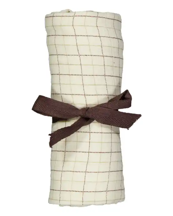 Diese beige Mullwindel hat ein gewebtes Karomuster und ist 110 mal 110 cm groß. Durch das große Format kann man die Windel auf verschiedene Arten verwenden, zum Beispiel als Wickeltuch oder Unterlage für das Baby. Das leichte und weiche Material fühlt sich angenehm auf der Haut an, sodass das Baby beim Wickeln oder Füttern bequem bleibt.