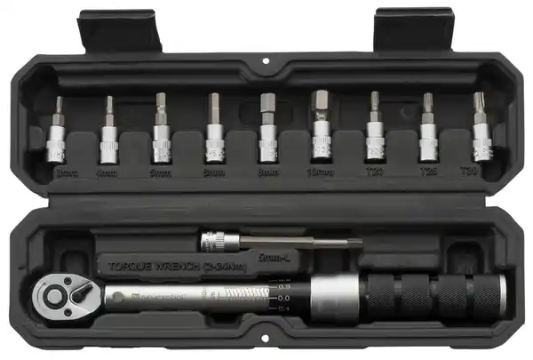Ideal für Montagearbeiten am Fahrrad > Zum kontrollierten Anziehen von Schrauben > 1 Drehmomentschlüssel mit Drehmomentskala > 1 Stecknuss mit langem Innensechskant-Bit (H5) > 6 Innensechskant-Bits (H3/H4/H5/H6/H8/H10) > 3 Innensechskant-Bits rund (T20/T25/T30) > Feinverzahnt, mit 1/4-Zoll-Antrieb > Drehmoment-Einstellung am Handgriff (2 - 24 Nm) > Länge (Drehmomentschlüssel) ca. 25 cm > Inkl. Aufbewahrungsbox > 3 Jahre Garantie