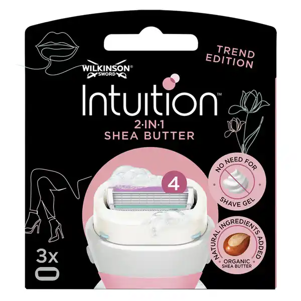 Wilkinson Intuition Nachfüllpack mit drei Klingen. Diese Rasiermesser sind ideal zum Rasieren der Beine. Die Rasiermesser haben vier ultradünne Klingen und sind mit Shea-Butter beschichtet. Wenn der Rasierer unter Wasser gehalten wird, schäumt die Shea-Butter. Befeuchtet und glättet die Haut einfach und schnell ohne Rasiergel.