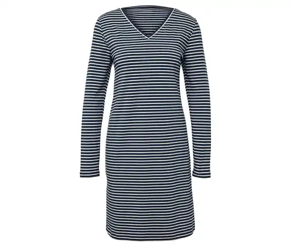 Nachthemd Farbe: Dunkelblau-weiß gestreift Material: 58% Baumwolle (Unterstützt die Initiative Cotton made in Africa), 39% Viskose, 3% Elasthan Maße: Gesamtlänge ca. 94 cm (Gr. M 40/42) Weiches Material aus Baumwolle und ViskoseMit V-AusschnittMit hochwertigem Markenelasthan für Langlebigkeit und hohe Waschbeständigkeit