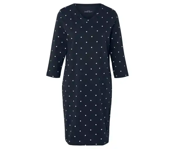 Nachthemd Farbe: Dunkelblau mit cremefarbenen Punkten Material: 95% Baumwolle, 5% Elasthan Maße: Gesamtlänge 94,1 cm (Gr. M 40/42) Angenehm weiche Baumwoll-Stretch-QualitätV-AusschnittMit hochwertigem Markenelasthan für Langlebigkeit und hohe WaschbeständigkeitMit Bio-Baumwolle