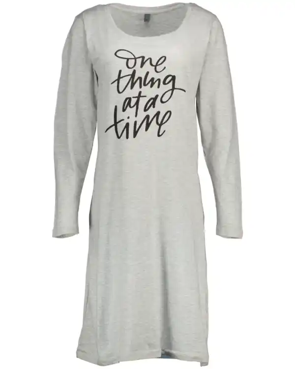 Dieses graue Damen-Nachthemd hat lange Ärmel und einen runden Halsausschnitt, damit du es beim Schlafen etwas wärmer hast. Auf der Vorderseite steht der Text „one thing at a time“, was dem Nachthemd ein verspieltes Detail gibt. Es besteht aus Baumwolle mit 2% Polyester, wodurch sich der Stoff weich anfühlt und locker fällt. Durch die gerade Passform kannst du bequem schlafen.
