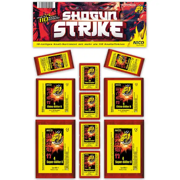 Knall-Sortiment aus 10 Teilen und mehr als 110 Knalleffekten. Mit ultralauten China-Riesen, D-Böllern, China- und Paket-Crackern.