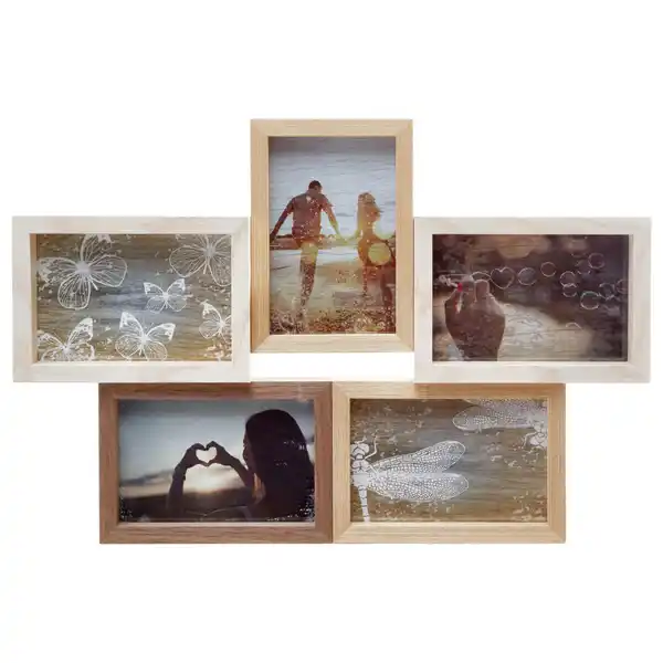 Mit diesem Collagen-Bilderrahmen in Holzoptik haben Sie jeden Tag die glücklichsten Erinnerungen vor Augen. In den 5 Rahmen, die für ca. 10 x 15 cm (B x L) große Bilder geeignet sind, zeigen Sie Freunden und Familie Urlaubsorte, Ihre Liebsten und gelungene Schnappschüsse. Verschiedene Holzfarben verbreiten Wärme und harmonieren mit fast jedem Motiv. Blicken Sie mit diesem Collagen-Bilderrahmen in Holzoptik auf Ihre fröhlichsten Erlebnisse zurück!