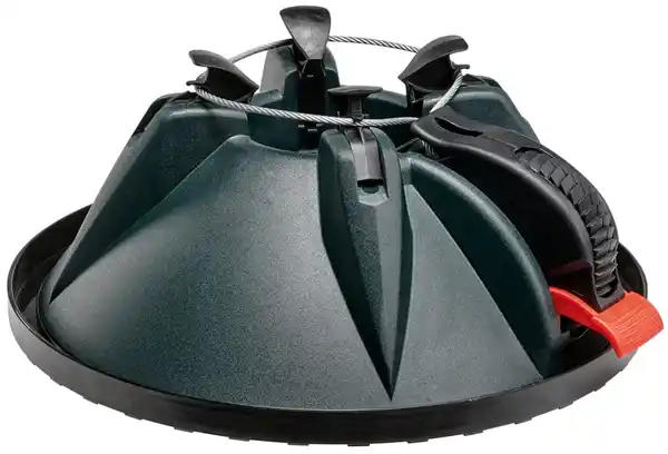 Moderne Neuauflage in hochwertigem Dunkelgrün! Der patentierte Christbaumständer Klick Fix mit Fußrolle in Kombination mit Rundum-Ein-Seil-Technik macht das Baumaufstellen bequem und leicht.