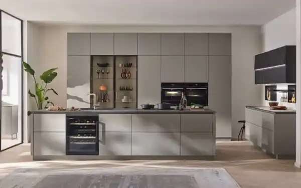 Ausführung in Taupengrau, praktische Griffmulden in Edelstahl, Stellmaß ca. 190 x 420 x 340 cm. Inklusive Elektrogeräte. Geräteabbildungen ähnlich.
