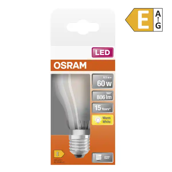 6,5 W, 806 lm, 2.700 K (warmweiß) > Lebensdauer ca. 15.000 h > Energieeffizienzklasse E (Spektrum A bis G)