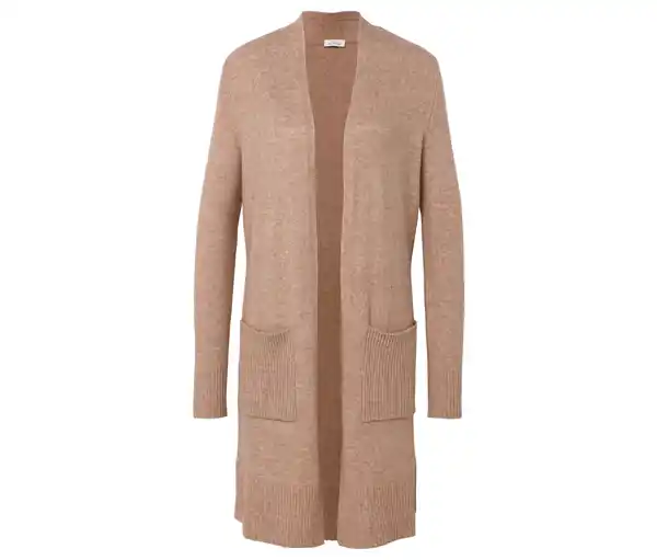 Offener Longcardigan Farbe: Beige meliert Material: 42% Polyester, 32% Polyacryl, 17% Polyamid, 6% Wolle, 3% Elasthan Maße: Gesamtlänge ca. 95 cm (Gr. M 40/42) Passform: Regular Fit Weiche, wärmende Qualität mit WolleAufgesetzte Taschen auf der VorderseiteHochwertige, haarige OptikBreite Rippbündchen an Ärmelabschluss und SaumSchmaler SchalkragenMit Elasthan: formbeständig, perfekter Sitz, hoher TragekomfortDiese Strickjacke beinhaltet 6% RWS-zertifizierte Wolle, zertifiziert durch CU 809415
