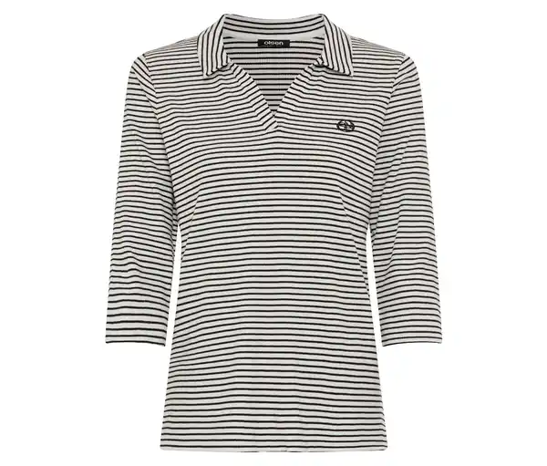 Olsen Polo-Shirt Farbe: Weiß mit schwarzen Streifen Material: 96% Baumwolle, 4% Elasthan Maße: Gesamtlänge ca. 62 cm Sonstige Hinweise: Dieses Polo-Shirt vereint sportliche Lässigkeit mit femininer Eleganz. Das modische Streifenmuster sorgt für einen frischen Look, während der offene Polokragen das Design leger abrundet. Die 3/4-Ärmel mit klassischem Schnitt machen es zu einem perfekten Allrounder für jeden Tag. Kleine Seitenschlitze am Saum verleihen zusätzliche Bewegungsfreiheit. Unterstreicht die Silhouette, ohne einzuengen Colour ID: 80000 EAN code: Gr. 36: 4063749517105 Gr. 38: 4063749517112 Gr. 40: 4063749517129 Gr. 42: 4063749517136 Gr. 44: 4063749517143 Gr. 46: 4063749517150 Gr. 48: 4063749517167 Hersteller: Olsen Mode GmbH, Friesenweg 28, 22763 Hamburg E-Mail: serviceteam@olsen.de Passform: Slim Fit Geschnitten in der eng anliegenden Olsen-Passform »Edda«Sportliches Polo-Shirt mit offenem Kragen3/4-Ärmel mit klassischem SchnittElastische Baumwollmischung für hohen TragekomfortVielseitig kombinierbar – sportlich oder casual