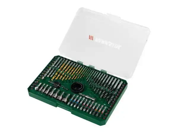 100-teiliges Allround-Set Produktmerkmale ;} Inhalt: 60x Schraub-Bits: 49x Bits (25 mm) und 11x Bits (50 mm); 7x Steckschlüssel-Bits 5/6/8/10/11/12/13 mm; 1x magnetischer Bithalter 29x Bohrer: 13x Holzbohrer (Ø: 2,0/2,5/3,0/3,5/4,0/4,5/5,0/5,5/6,0/6,5/7,0/7,5/8,0 mm); 12x HSS-Metallbohrer (Ø: 1,5/2,0/2,5/3,0/3,5/4,0/4,5/5,0/5,5/6,0/6,5/7,0 mm); 3x Steinbohrer (Ø: 6,0/7,0/8,0 mm); 1x Senkbohrer (Ø: 12,7 mm); 2x Lochsägen (Ø: 32 / 44 mm) 1x Zentrierbohrer Material: Stahl Maße: ca. L 29,5 x B 21 x H 3,7 cm Gewicht: ca. 1,5 kg