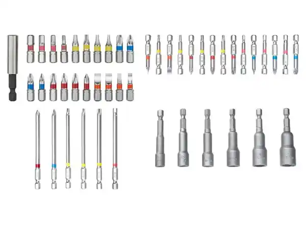 Maße:Bit-Set 21-teilig: 20x ca. L 25 mm; Bit-Set 15-teilig: 15x ca. L 50 mm; Bit-Set 6-teilig: 6x ca. L 100 mm; Steckschlüssel-Set: 6x ca. L 65 x Ø 6/7/8/10/12/13 mm