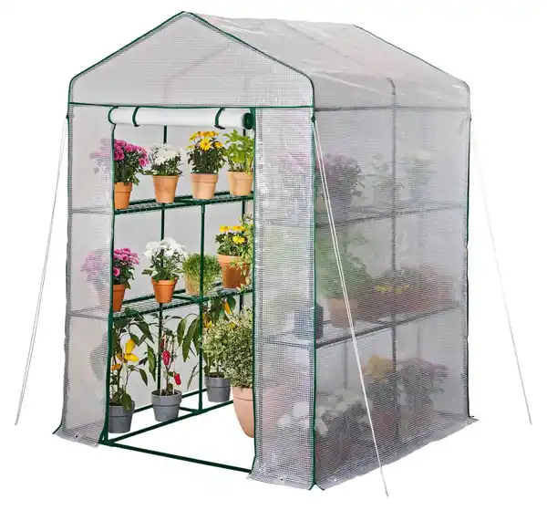 Stabile Metall-Konstruktion > Mit reißfester Gewebefolie > Witterungs- und UV-beständig > Begehbar > Beidseitig mit 2 durchlaufenden Regalebenen > Tragkraft je Regalebene max. 20 kg > Eingang mit Reißverschlüssen und Clip > Belüftungsfenster mit Klettverschlüssen und Clip > Einfacher Aufbau mit Steckverbindungen > Größe ca. B/T 140 x H 200 cm > Inkl. 16 Erdspießen und 4 Seilen > 3 Jahre Garantie