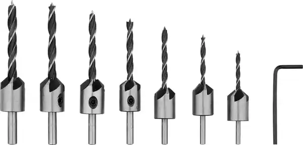 Bohrer aus Karbonstahl > Vorbohren und Senken in einem Arbeitsgang > Zur Bearbeitung von Holz > Für gängige Bohrmaschinen und Akkuschrauber > Inkl. Innensechskantschlüssel