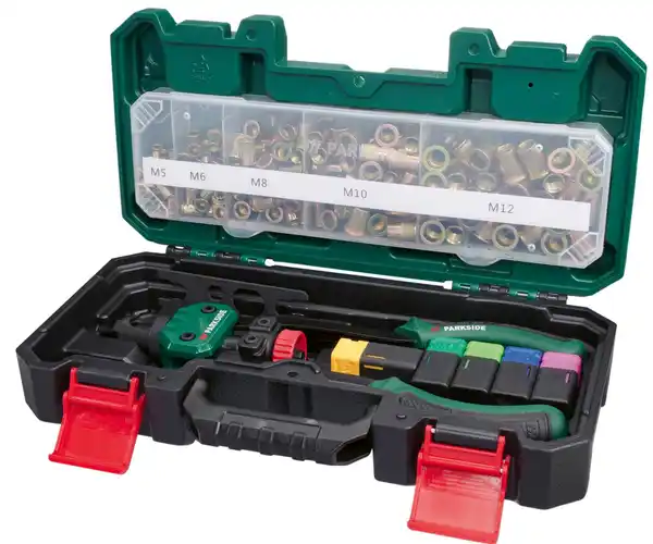 Zum Nieten von Muttern > Zum Senkloch-Einbringen durch Mutter-Einnieten > Inkl. 150 Muttern versch. Größen (M5 - M12) > 3 Jahre Garantie