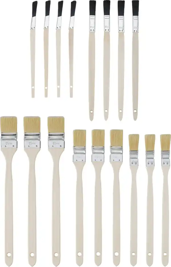 Aus Holz > Mit synthetischen Borsten > Hohe Deckkraft und beste Streichergebnisse > Geeignet für Dispersionsfarben, Lasuren, Lacke > Je 4 Heizkörperpinsel ca. 15 und 20 mm > Je 3 Heizkörperpinsel ca. 25, 38 und 50 mm