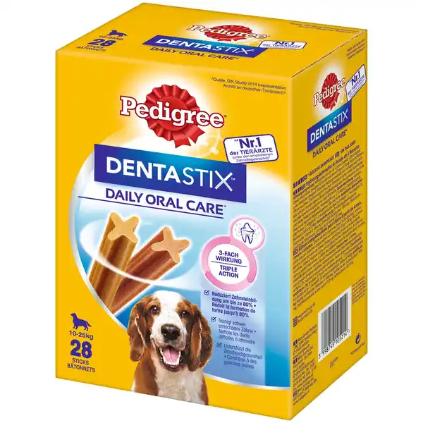 Eigenschaften- Marke: PEDIGREE - Serienname: Dentastix™ - Anwendungsbereich: Tierfütterung - Futtermittelart: Ergänzungsfuttermittel - Geschmacksrichtung: Fleisch - geeignet für folgende Tierarten: Hunde
