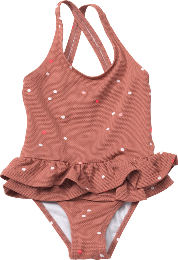 Dieser gepunktete Badeanzug in Größe 110/116 von PUSBLU ist in altrosa gestaltet und besitzt niedliche Rüschen und überkreuzte Träger als hübsche Details. Verziert ist er mit Punkten in weiß, rosa und pink. Zudem ist er aus schnell trocknendem Material für viel Spaß im Wasser hergestellt - egal, ob im Planschbecken daheim, im Urlaub oder im Pool. Die Filial-Verfügbarkeit des Angebots erfolgt auf der Händlerseite des Produktes.