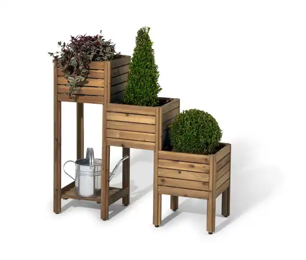 Pflanztreppe Farbe: Holz naturfarben Innenliegender Boden silberfarben Folie und Füße schwarz Material: FSC®-zertifiziertes Massivholz, lasiert Schrauben und Beschläge Stahl, verzinkt Folie 100% Polyethylen Bodenplatte der Pflanzkästen Stahl, verzinkt Bodenschoner 100% Polypropylen Maße: B x H x T ca. 103 x 110 x 40 cm B x H x T Pflanzbox innen ca. 35,8 x 27,5 x 35,8 cm Abstand Regalboden und hoher Pflanzkasten ca. 62 cm Bodenfreiheit mittlerer Pflanzkasten ca. 48 cm, niedriger Pflanzkasten ca. 20,5 cm Inhalt: Inkl. Bodenschonern, perforierter Folie, Montagematerial und -anleitung Gewicht: Ca. 16 kg Tragkraft: Pflanzkästen je max. 35 kg Regalboden max. 10 kg Füllmenge: Pflanzkasten je ca. 32 l Sonstige Hinweise: Artikel wird zerlegt geliefert Lieferung in 1 Packstück B x H x T Packstück ca. 110,8 x 26,7 x 45,1 cm, Gewicht ca. 16,6 kg 3 seperate Pflanzkästen auf verschiedenen EbenenRegalboden unter dem oberstem Pflanzkasten bietet zusätzlichen Stauraum für z.B. SchuhePflanzkästen mit verzinktem Stahlboden: leichtes Gefälle und Wasserablauf verhindern StaunässePflanzkästen mit innenliegender Folie, Folienboden perforiert für WasserdurchlassHöhenverstellbare Bodenschoner, fester Stand auch auf unebenen FlächenAus FSC®-zertifiziertem Massiv-Holz, lasiertUV- und witterungsbeständig