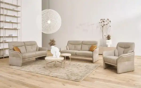 Moderne Polstergarnitur mit echt Lederbezug Soft Nappa in der Farbe Island, Polsterung mit Formasoft Polyschaum, Sitzhärte Medium,