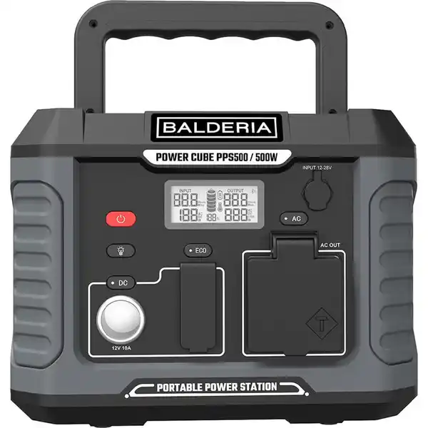 Die Power-Station 'Balderia Power Cube Pps500' (tragbar) mit USB-Anschluss ist eine tolle Idee für die Gartenparty oder den Campingausflug. Denn damit haben Sie Ihre Stromquelle komfortabel mit dabei - ob die AC-Steckdose oder ein USB-Anschluss (3x USB 3.0 oder 1x Usb-Pd) benötigt wird, das clevere Gadget ist stets behilflich. Auch das kabellose Laden ist hier ganz bequem möglich. Als weitere Highlights verfügt das Gerät über eine integrierte Taschenlampe sowie ein kleines LED-Licht am Griff. Über das LCD-Display behalten Sie leicht den Überblick über Batteriestand, verbleibende Nutzungszeit, Ausgabeleistung und mehr. Mit einer Akkukapazität von ca. 18 Amperestunden (ca. 400 Wattstunden) ist das mobile Energie-Gadget vielseitig nutzbar und hält bei Ihren Outdoor-Unternehmungen lange durch. Mit dieser tragbaren Power-Station (ca. 500 Watt) mit USB-Anschluss sind Sie fortschrittlich on tour! Weitere technische Details: aufladbar über Steckdose, Autoanschluss (inklusive AC-Netzstecker + Autoladekabel) oder separat erhältliches Solarpanel Maße: ca. 23 x 18 x 17 cm (B x H x T) praktischer Griff zum einfachen Tragen cooles Design in Schwarz Lithium-Akku Zigarettenanzünder-Anschluss (12 Volt) SOS-Modus bei Beleuchtung ECO-Modus zum Energiesparen in- und outdoor