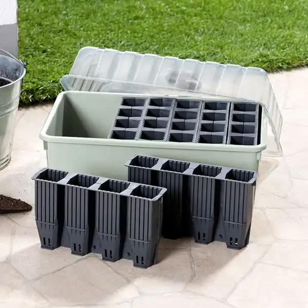 - Inhalt: 1 transparenter Deckel mit Belüftungsöffnung, 7 zweischalige Setzreihen mit je 4 Pflanzzellen, 1 Bodenschale