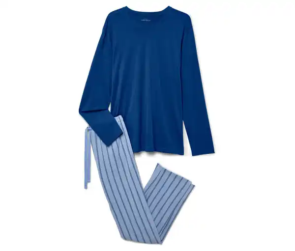 Pyjama Farbe: Oberteil dunkelblau Hose blau Material: 100% Baumwolle Maße: Oberteil Gesamtlänge ca. 77 cm Hose Innenbeinlänge ca. 77 cm (Gr. L 52/54) Passform: Regular Fit Schlafanzug aus reiner Baumwolle in Single-Jersey-QualitätLangarm-Oberteil mit RundhalsausschnittHose mit seitlichen Taschen, elastischem Bund und Bindeband