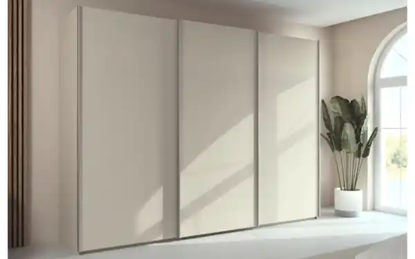 Moderner Schwebetürenschrank mit Korpus und Front in Champagnerfarbig, Griffleisten in Alufarbig,