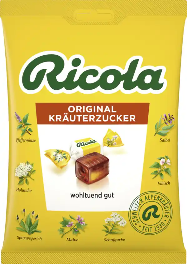 Ob rund oder eckig, ohne oder mit Zucker - unser Klassiker ist beliebt. Der Geschmack: Vertraut, wohltuend und angenehm frisch. Die Rezeptur für den original Schweizer Kräuterzucker ist seit 1940 nahezu unverändert und streng geheim, aber so viel sei verraten: Seine Kraft kommt aus den wohltuenden 13 Schweizer Bergkräutern, die das Herz eines jeden Ricola Bonbons bilden. Das Ricola Original - Wohltuend für Hals und Stimme.