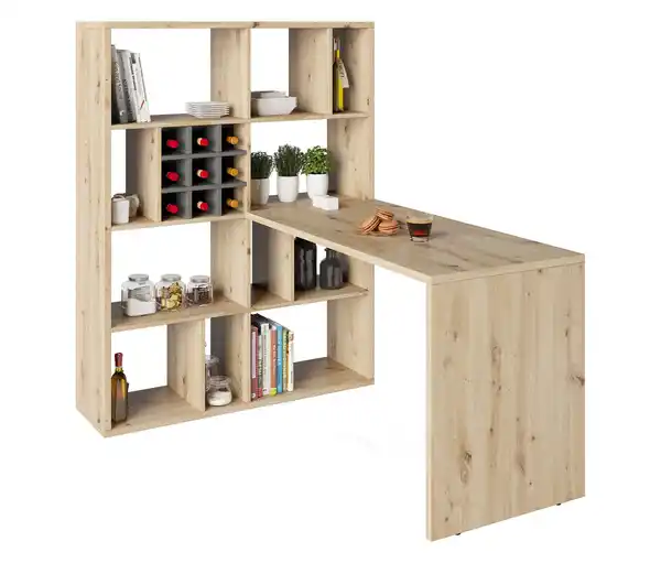 Roba Set, Raumteiler mit Schreibtisch, Artisan-Eichenoptik Farbe: Artisan-Eichenoptik Material: Spanplatte, melaminharzbeschichtet Kanten Acrylnitril-Butadien-Styrol-Copolymer Maße: B x H x T Schreibtisch ca. 120 x 75 x 57,9 cm B x H x T Regal ca. 112,5 x 149 x 34 cm Inhalt: Inkl. Montagematerial und -anleitung Gewicht: Regal ca. 54 kg Schreibtisch ca. 23 kg Tragkraft: Tischplatte max. 15 kg Fächer je max. 5 kg Gebrauchsanweisung: Regelmäßig abstauben, mit feuchtem Tuch die Oberflächen abwischen, trocken nachwischen Keine scharfen Reinigungsmittel verwenden Nur weiche und fusselfreie Tücher verwenden Nur nach Anleitung aufbauen, bitte alle Hinweise in der Aufbauanleitung beachten Sonstige Hinweise: Artikel wird zerlegt geliefert Lieferung in 3 Packstücken Anlieferung frei Bordsteinkante Anlieferung per Paketdienst Keine Inselbelieferung B x H x T Packstücke 1x ca. 43 x 10 x 152,2 cm, 1x ca. 43 x 11 x 130 cm, 1x ca. 67 x 9 x 131 cm Gewicht Packstücke 1x ca. 27 kg, 1x ca. 27,7 kg, 1x ca. 23 kg Regal mit asymmetrischer Struktur und Schreibtischanbau12 offene Fächer – ideal für Bücher, Deko oder AufbewahrungsboxenAsymmetrische Einteilung für einen modernen LookTeil der Fortuna-Systemserie – beliebig erweiterbar und kombinierbarIndividualisierbar mit Regaleinsätzen – nicht im Lieferumfang enthaltenRobuste Verarbeitung – Spanplatte mit Melaminharzbeschichtung und ABS-Kanten