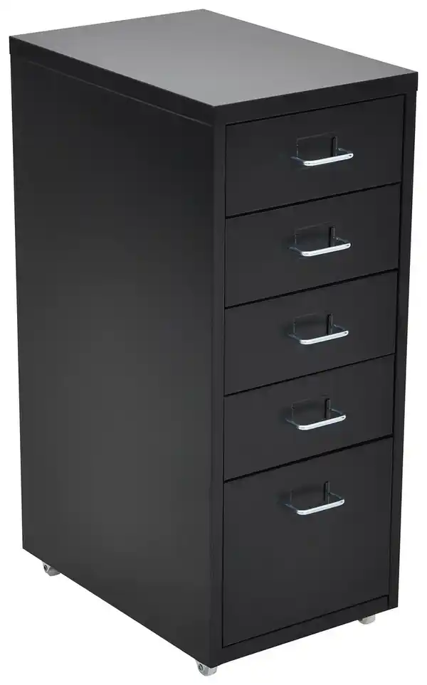 Der Rollcontainer METALLICA in Schwarz ist die ideale Lösung für mehr Ordnung im Büro oder Arbeitszimmer. Der Container ist aus Metall gefertigt und pulverbeschichtet. Die Oberfläche ist matt. Er verfügt über fünf Schubladen und bietet somit ausreichend Stauraum für Büromaterialien und Dokumente. Die Rollen sind aus Kunststoff gefertigt und ermöglichen ein einfaches Verschieben des Containers. Dank der Universalrollen und der Stoppfunktion ist er flexibel einsetzbar. Die Griffe sind aus Eisen gefertigt. Die Maße des Rollcontainers betragen ca. 28 x 69 x 41 cm (B x H x T).