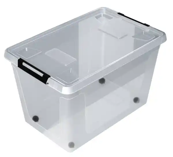 Aus Kunststoff > Deckel mit Clipverschluss > Mit 4 Rollen > Fassungsvermögen ca. 60 l > Größe ca. B 59 x H 36 x T 39 cm