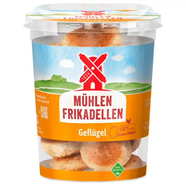 Die Mühlen Frikadellen 100 % Geflügel der Rügenwalder Mühle sind: - aus 100 %Geflügelfleisch, - fettfrei gebraten und - locker in der Konsistenz. Wie alle Produkte von der Rügenwalder Mühle werden die Mühlen Frikadellen ohne Zusatz von Geschmacksverstärkern und laktosefrei hergestellt und regelmäßig vom SGS Institut Fresenius kontrolliert. Im innovativen wieder verschließbaren Snackbecher sind Mühlen Frikadellen der ideale Snack für zwischendurch und unterwegs. - 100% Geflügel - hoher Proteingehalt - Geflügel zu 100% aus Deutschland - Mühlen Frikadellen schmecken kalt oder warm, als kleine Mahlzeit oder als Snack für zwischendurch.