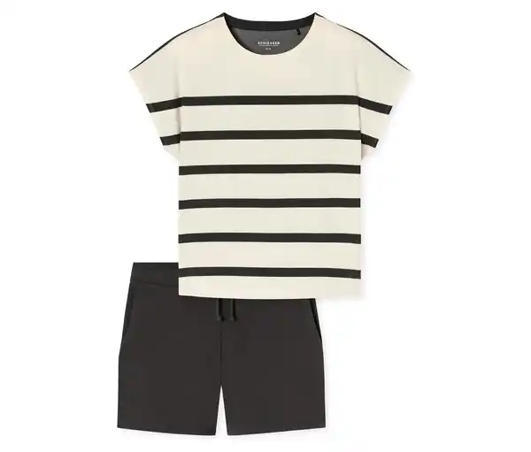 SCHIESSER Shorty-Set Farbe: Oberteil creme-anthrazit gestreift Hose anthrazit Material: 73% Baumwolle, 27% Polyester Sonstige Hinweise: SCHIESSER Stylenummer: 183568-104 Hersteller: SCHIESSER GmbH, Schützenstraße 18, 78315 Radolfzell, Deutschland E-Mail: info@schiesser.com Kurzer Damen-Schlafanzug mit Ringelshirt in Creme und Anthrazit und Hose in AnthrazitAus der SCHIESSER Serie »Casual Nightwear«Shirt im Loose-Fit-Schnitt mit angeschnittenen Ärmeln, Vorder- und Rückseite konträr gestreiftKurze, weit geschnittene Hose mit Bindeband und seitlichen TaschenSchnelltrocknendes Material mit kühlender NoteHochwertige Baumwoll-Qualität mit innovativer Mikrofaser aus MaisstärkeUnsere Models tragen Größe M/38