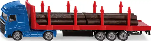 Ist die Arbeit im Kinderzimmerforst mit den SIKU-Modellen Harvester, Forwarder und Traktor mit Forstanhänger getan, muss die Ernte des Waldes noch zum Sägewerk transportiert werden. Dies erledigt die bärenstarke MAN-Sattelzugmaschine mit dem Holz-Transport-Auflieger. Die vordere Schutzwand und die seitlichen Rungen gewährleisten einen sicheren Transport der als Ladung beigefügten Baumstämme aus Kunststoff. Das Modell rollt auf gummierten Rädern mit LKW-Felgendesign.