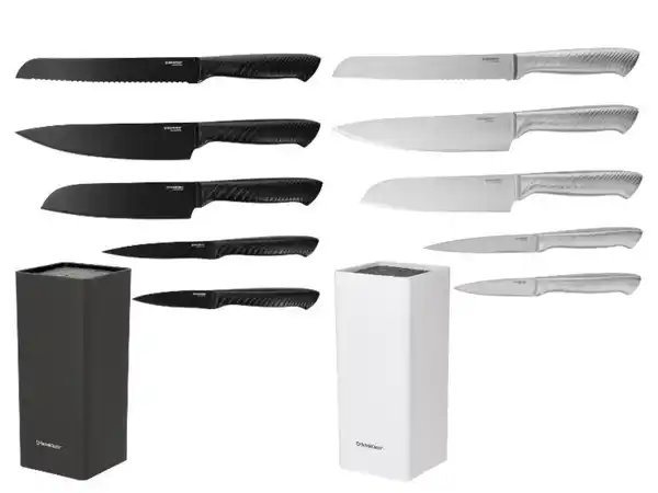 - Bestehend aus 1x Messerblock, 1x Kochmesser, 1x Santoku-Messer, 1x Brotmesser, 1x Universalmesser und 1x Schälmesser