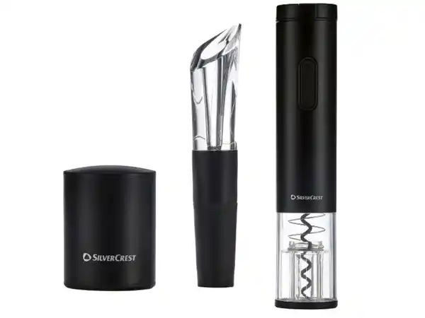 Mit Flaschenstopfen und Ausgießer Für Natur- und Kunstkorken geeignet Praktische Einhandbedienung Integrierter Folienschneider Mit weißem LED-Licht Rechts- und Linkslauf Inkl. 4x AA-Alka Bedienungsanleitung Produktmerkmale Besonderheit: Einhandbedienung Funktionen: RechtsLinkslauf Zubehör: Flaschenstopfen; Ausgießer; 4x AA-Batterien Material: Kunststoff, Edelstahl Maße: ca. Ø 4,6 x H 23,2 cm Gewicht: ca. 275 g Lieferumfang: 1x Elektrischer Korkenzieher, 1x Folienschneider, 1x Flaschenstopfen, 1x Ausgießer; 4x AA-Batterien, 1x Bedienungsanleitung